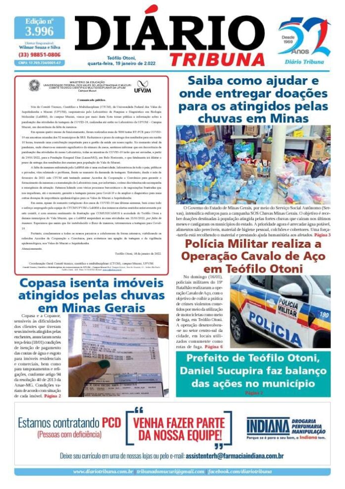 Diário Tribuna, 19 de Janeiro 2022, Teófilo Otoni – MG Por diariotribuna - 19/01/2022 0 506 Facebook Twitter Google+ Pinterest WhatsApp Acesse o link abaixo e veja a edição completa do Diário Tribuna desta quarta-feira (19/01/2022) https://diariotribuna.com.br/wp-content/uploads/2022/01/DIARIO-TRIBUNA-52-ANOS-19-JANEIRO-2022.pdf