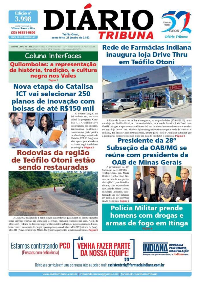 Diário Tribuna, 21 de Janeiro 2022, Teófilo Otoni – MG Por diariotribuna - 21/01/2022 0 751 Facebook Twitter Google+ Pinterest WhatsApp Acesse o link abaixo e veja a edição completa do Diário Tribuna desta sexta-feira (21/01/2022) https://diariotribuna.com.br/wp-content/uploads/2022/01/DIARIO-TRIBUNA-52-ANOS-21-JANEIRO-2022.pdf