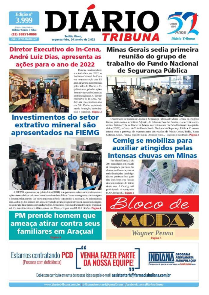 Diário Tribuna, 24 de Janeiro 2022, Teófilo Otoni – MG Por diariotribuna - 24/01/2022 0 697 Facebook Twitter Google+ Pinterest WhatsApp Acesse o link abaixo e veja a edição completa do Diário Tribuna desta segunda-feira (24/01/2022) https://diariotribuna.com.br/wp-content/uploads/2022/01/DIARIO-TRIBUNA-52-ANOS-24-JANEIRO-2022.pdf