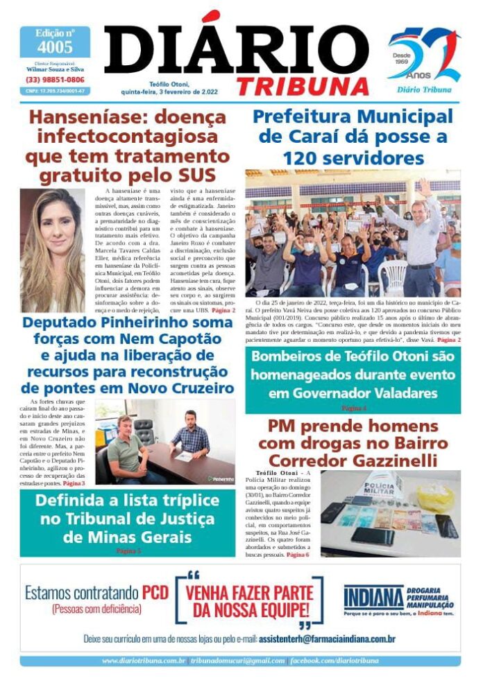 Diário Tribuna, 03 de Fevereiro 2022, Teófilo Otoni – MG Por diariotribuna - 03/02/2022 0 589 Facebook Twitter Google+ Pinterest WhatsApp Acesse o link abaixo e veja a edição completa do Diário Tribuna desta quinta-feira (03/02/2022) https://diariotribuna.com.br/wp-content/uploads/2022/02/DIARIO-TRIBUNA-52-ANOS-03-FEVEREIRO-2022.pdf