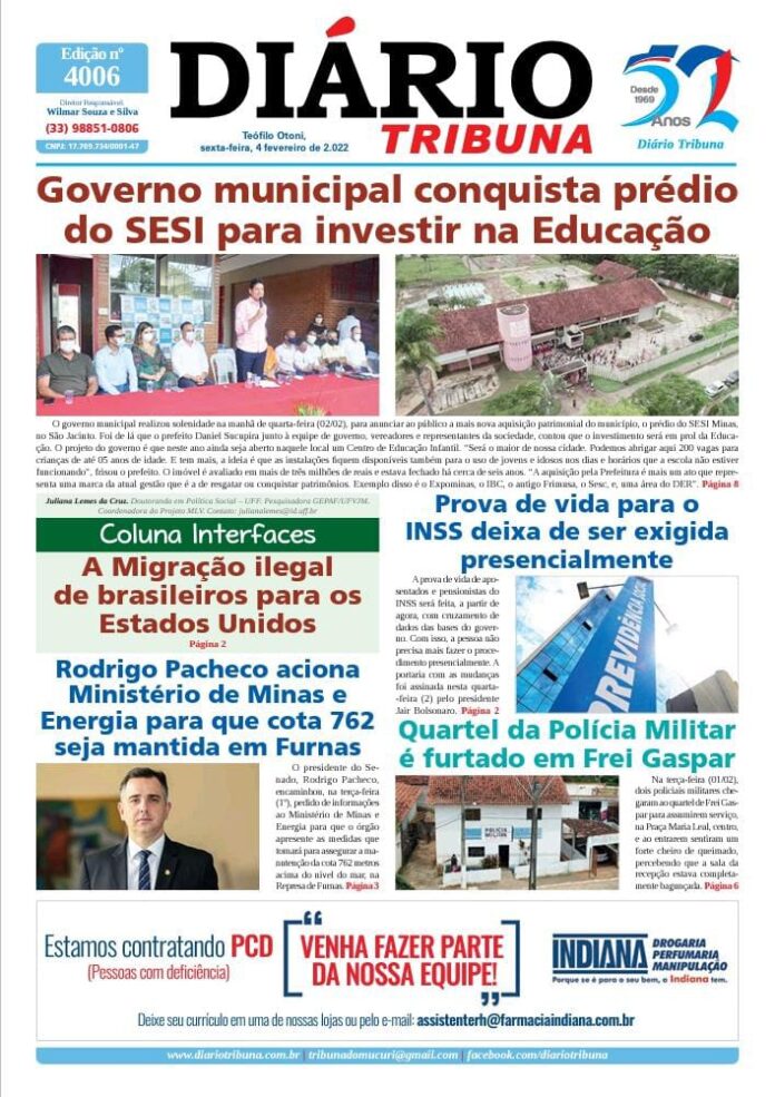 Diário Tribuna, 04 de Fevereiro 2022, Teófilo Otoni – MG Por diariotribuna - 04/02/2022 0 368 Facebook Twitter Google+ Pinterest WhatsApp Acesse o link abaixo e veja a edição completa do Diário Tribuna desta sexta-feira (04/02/2022) https://diariotribuna.com.br/wp-content/uploads/2022/02/DIARIO-TRIBUNA-52-ANOS-04-FEVEREIRO-2022.pdf