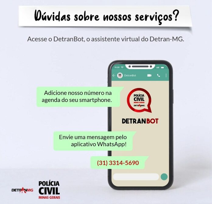 A Polícia Civil de Minas Gerais, por meio do Departamento de Trânsito de Minas Gerais (Detran-MG), desde a manhã de quinta-feira (03/02), oferece aos cidadãos uma nova modalidade de atendimento on-line para quem busca pelos serviços de trânsito: o “DetranBot”. A nova ferramenta, inicialmente desenvolvida pelos servidores da Ciretran de Ponte Nova e utilizada na cidade, se estendeu para todo o estado de Minas Gerais devido aos bons resultados.