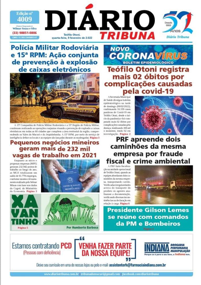Diário Tribuna, 09 de Fevereiro 2022, Teófilo Otoni – MG Por diariotribuna - 09/02/2022 0 661 Facebook Twitter Google+ Pinterest WhatsApp Acesse o link abaixo e veja a edição completa do Diário Tribuna desta quarta-feira (09/02/2022) https://diariotribuna.com.br/wp-content/uploads/2022/02/DIARIO-TRIBUNA-52-ANOS-09-FEVEREIRO-2022.pdf