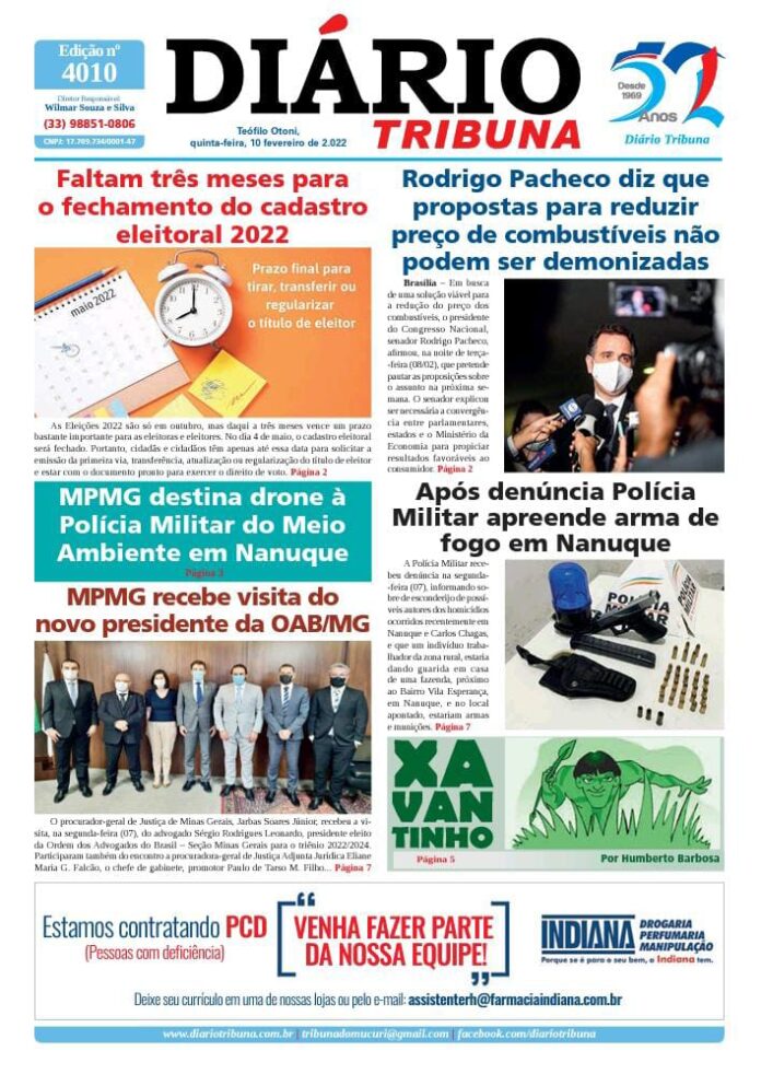 Diário Tribuna, 10 de Fevereiro 2022, Teófilo Otoni – MG Por diariotribuna - 10/02/2022 0 455 Facebook Twitter Google+ Pinterest WhatsApp Acesse o link abaixo e veja a edição completa do Diário Tribuna desta quinta-feira (10/02/2022) https://diariotribuna.com.br/wp-content/uploads/2022/02/DIARIO-TRIBUNA-52-ANOS-10-FEVEREIRO-2022.pdf