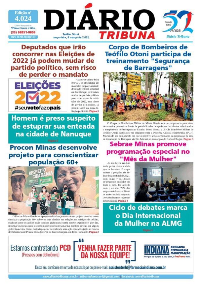 Diário Tribuna, 08 de Março 2022, Teófilo Otoni – MG Por diariotribuna - 08/03/2022 0 454 Facebook Twitter Google+ Pinterest WhatsApp Acesse o link abaixo e veja a edição completa do Diário Tribuna desta terça-feira (08/03/2022) https://diariotribuna.com.br/wp-content/uploads/2022/03/DIARIO-TRIBUNA-52-ANOS-08-MARCO-2022.pdf