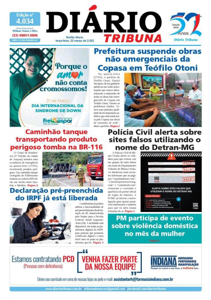 Diário Tribuna, 22 de Março 2022, Teófilo Otoni – MG Por diariotribuna - 22/03/2022 0 549 Facebook Twitter Google+ Pinterest WhatsApp Acesse o link abaixo e veja a edição completa do Diário Tribuna desta terça-feira (22/03/2022) https://diariotribuna.com.br/wp-content/uploads/2022/03/DIARIO-TRIBUNA-52-ANOS-22-MARCO-2022.pdf