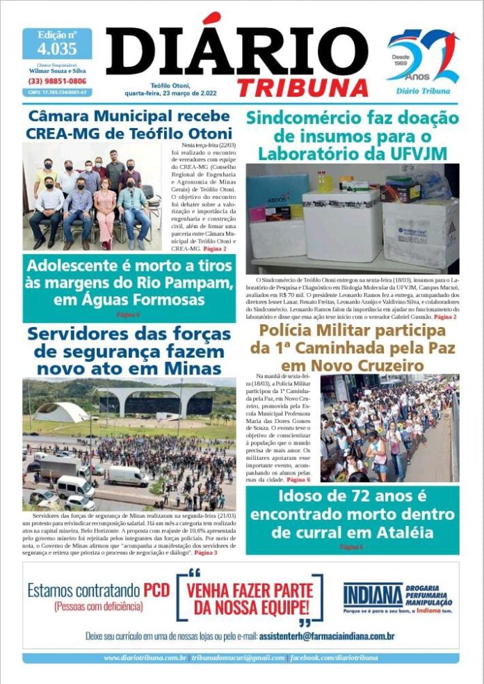 Diário Tribuna, 23 de Março 2022, Teófilo Otoni – MG Por diariotribuna - 23/03/2022 0 369 Facebook Twitter Google+ Pinterest WhatsApp Acesse o link abaixo e veja a edição completa do Diário Tribuna desta quarta-feira (23/03/2022) https://diariotribuna.com.br/wp-content/uploads/2022/03/DIARIO-TRIBUNA-52-ANOS-23-MARCO-2022.pdf
