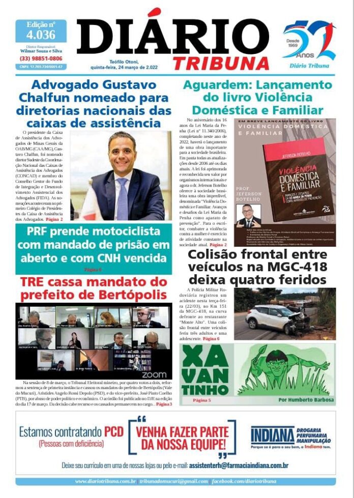 Diário Tribuna, 24 de Março 2022, Teófilo Otoni – MG Por diariotribuna - 24/03/2022 0 636 Facebook Twitter Google+ Pinterest WhatsApp Acesse o link abaixo e veja a edição completa do Diário Tribuna desta quinta-feira (24/03/2022) https://diariotribuna.com.br/wp-content/uploads/2022/03/DIARIO-TRIBUNA-52-ANOS-24-MARCO-2022.pdf