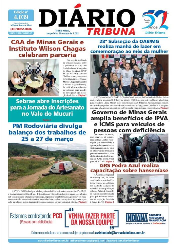 Diário Tribuna, 29 de Março 2022, Teófilo Otoni – MG Por diariotribuna - 29/03/2022 0 669 Facebook Twitter Google+ Pinterest WhatsApp Acesse o link abaixo e veja a edição completa do Diário Tribuna desta terça-feira (29/03/2022) https://diariotribuna.com.br/wp-content/uploads/2022/03/DIARIO-TRIBUNA-52-ANOS-29-MARCO-2022.pdf