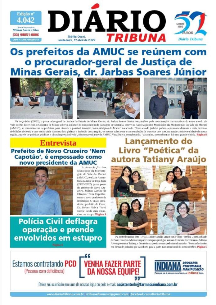 Diário Tribuna, 1º de Abril 2022, Teófilo Otoni – MG Por diariotribuna - 01/04/2022 0 735 Facebook Twitter Google+ Pinterest WhatsApp Acesse o link abaixo e veja a edição completa do Diário Tribuna desta sexta-feira (1º/04/2022) https://diariotribuna.com.br/wp-content/uploads/2022/04/DIARIO-TRIBUNA-52-ANOS-01-ABRIL-2022.pdf