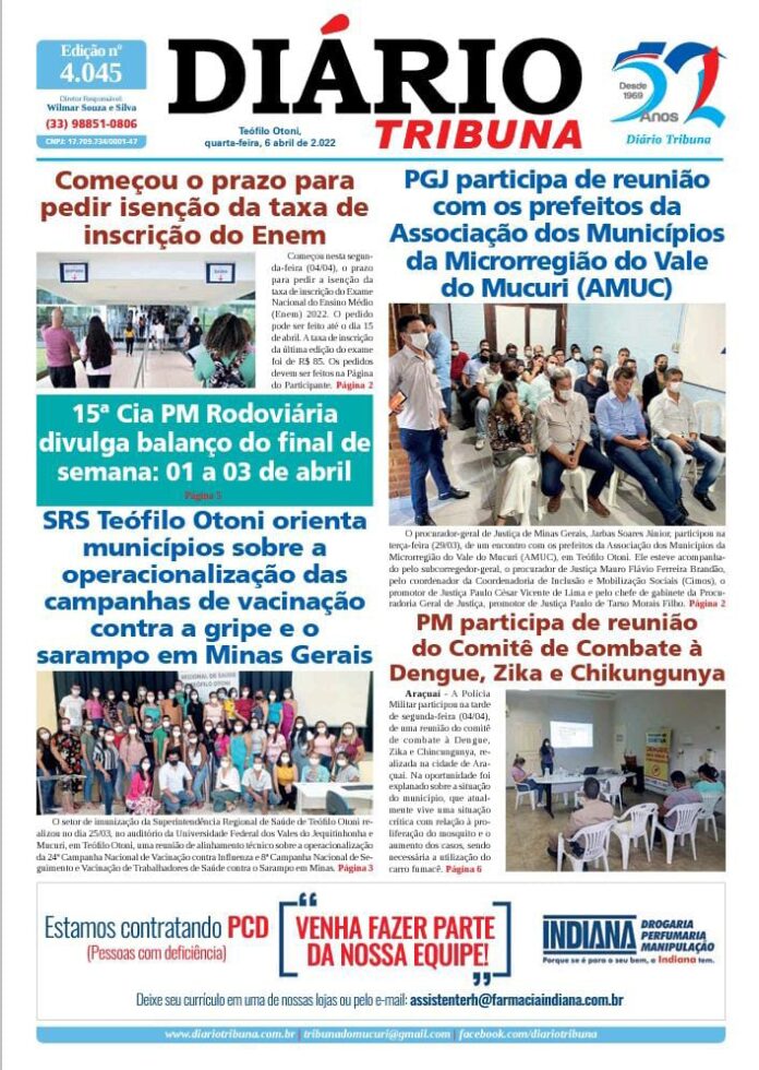 Diário Tribuna, 6 de Abril 2022, Teófilo Otoni – MG Por diariotribuna - 06/04/2022 0 514 Facebook Twitter Google+ Pinterest WhatsApp Acesse o link abaixo e veja a edição completa do Diário Tribuna desta quarta-feira (06/04/2022) https://diariotribuna.com.br/wp-content/uploads/2022/04/DIARIO-TRIBUNA-52-ANOS-06-ABRIL-2022.pdf