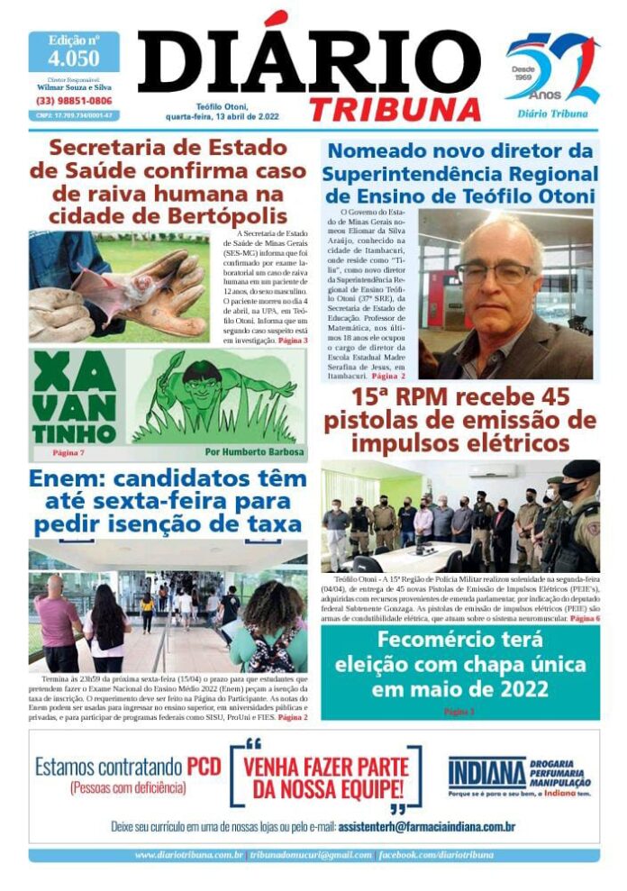 Diário Tribuna, 13 de Abril 2022, Teófilo Otoni – MG Por diariotribuna - 13/04/2022 0 592 Facebook Twitter Google+ Pinterest WhatsApp Acesse o link abaixo e veja a edição completa do Diário Tribuna desta quarta-feira (13/04/2022) https://diariotribuna.com.br/wp-content/uploads/2022/04/DIARIO-TRIBUNA-52-ANOS-13-ABRIL-2022.pdf