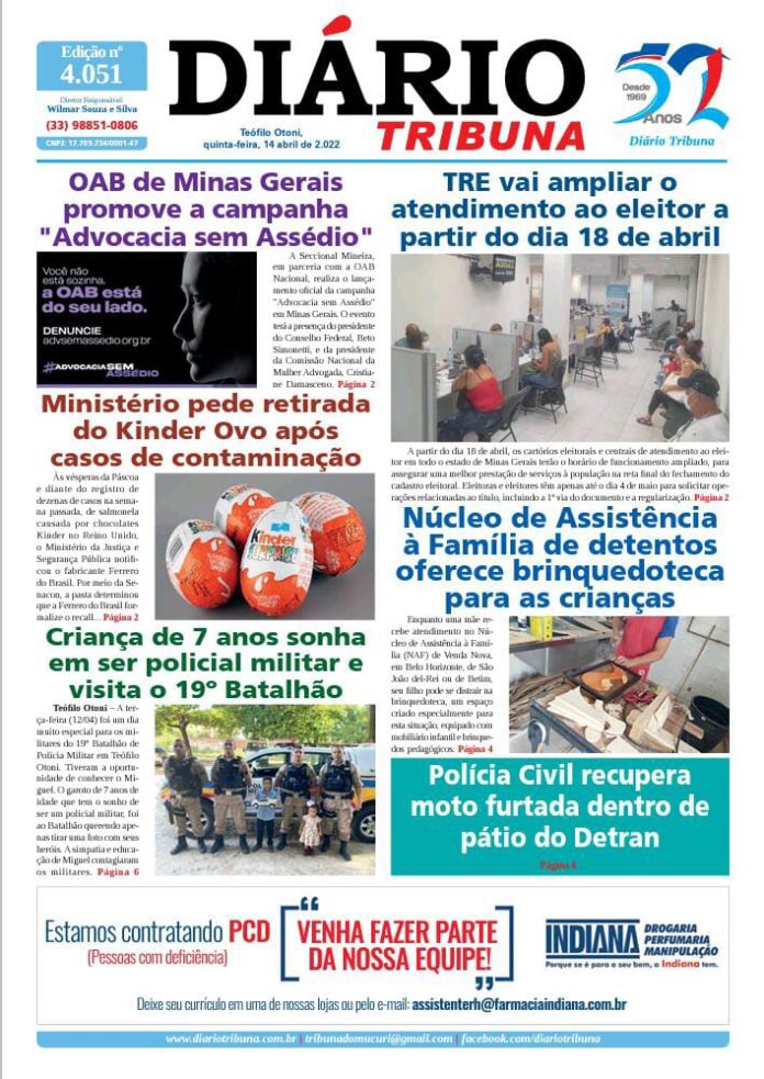 Diário Tribuna, 14 de Abril 2022, Teófilo Otoni – MG Por diariotribuna - 14/04/2022 0 888 Facebook Twitter Google+ Pinterest WhatsApp Acesse o link abaixo e veja a edição completa do Diário Tribuna desta quinta-feira (14/04/2022) https://diariotribuna.com.br/wp-content/uploads/2022/04/DIARIO-TRIBUNA-52-ANOS-14-ABRIL-2022.pdf