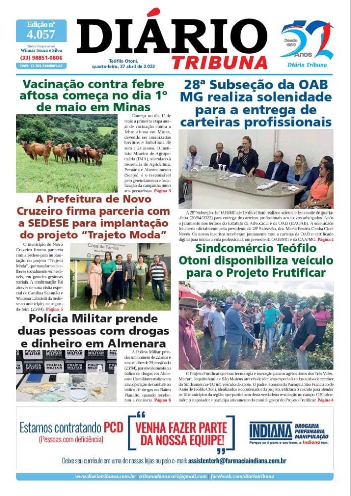 Diário Tribuna, 27 de Abril 2022, Teófilo Otoni – MG Por diariotribuna - 27/04/2022 0 698 Facebook Twitter Google+ Pinterest WhatsApp Acesse o link abaixo e veja a edição completa do Diário Tribuna desta quarta-feira (27/04/2022) https://diariotribuna.com.br/wp-content/uploads/2022/04/DIARIO-TRIBUNA-52-ANOS-27-ABRIL-2022.pdf