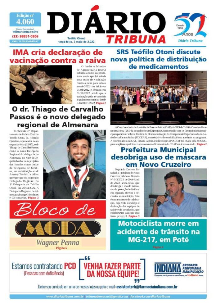 Diário Tribuna, 03 de Maio 2022, Teófilo Otoni – MG Por diariotribuna - 03/05/2022 0 710 Facebook Twitter Google+ Pinterest WhatsApp Acesse o link abaixo e veja a edição completa do Diário Tribuna desta terça-feira (03/05/2022) https://diariotribuna.com.br/wp-content/uploads/2022/05/DIARIO-TRIBUNA-52-ANOS-03-MAI-2022.pdf