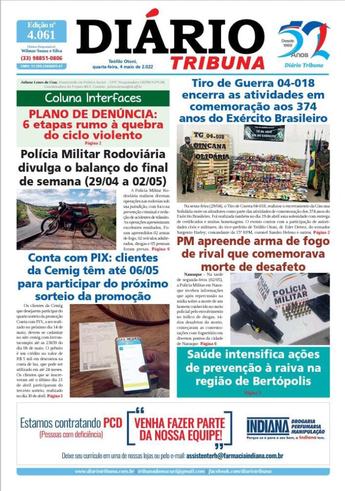 Diário Tribuna, 04 de Maio 2022, Teófilo Otoni – MG Por diariotribuna - 04/05/2022 0 754 Facebook Twitter Google+ Pinterest WhatsApp Acesse o link abaixo e veja a edição completa do Diário Tribuna desta quarta-feira (04/05/2022) https://diariotribuna.com.br/wp-content/uploads/2022/05/DIARIO-TRIBUNA-52-ANOS-04-MAIO-2022.pdf