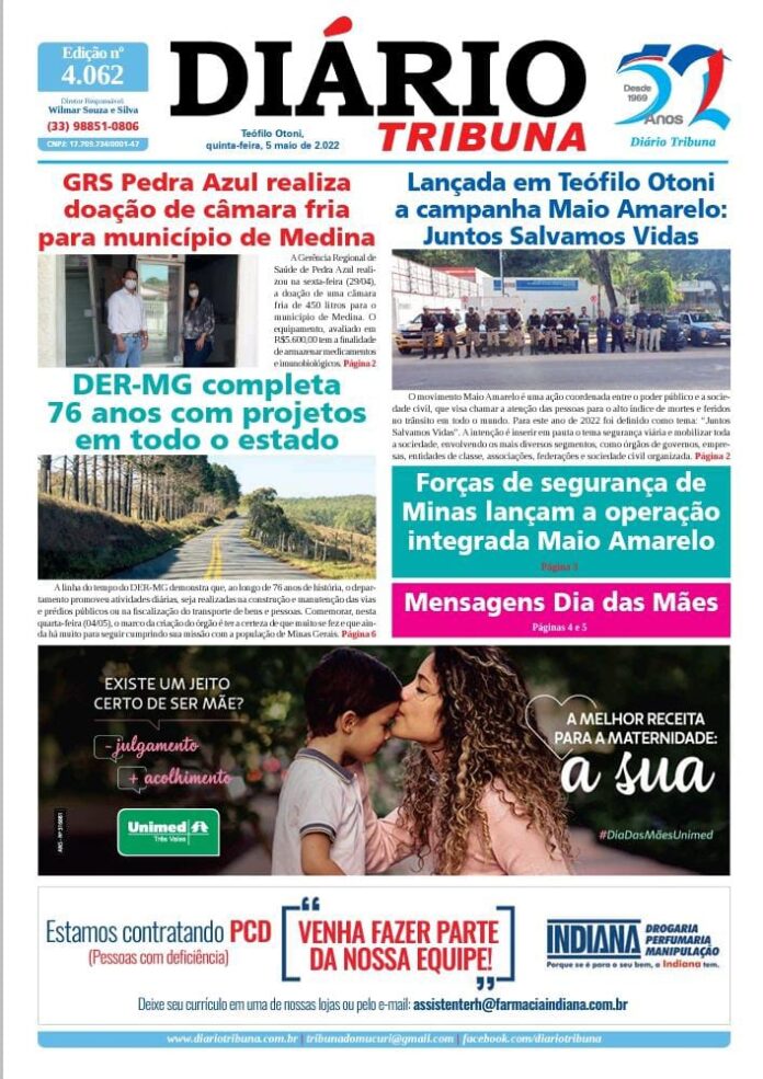 Diário Tribuna, 05 de Maio 2022, Teófilo Otoni – MG Por diariotribuna - 05/05/2022 0 621 Facebook Twitter Google+ Pinterest WhatsApp Acesse o link abaixo e veja a edição completa do Diário Tribuna desta quinta-feira (05/05/2022) https://diariotribuna.com.br/wp-content/uploads/2022/05/DIARIO-TRIBUNA-52-ANOS-05-MAIO-2022.pdf