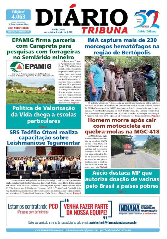 Diário Tribuna, 06 de Maio 2022, Teófilo Otoni – MG Por diariotribuna - 06/05/2022 0 730 Facebook Twitter Google+ Pinterest WhatsApp Acesse o link abaixo e veja a edição completa do Diário Tribuna desta sexta-feira (06/05/2022) https://diariotribuna.com.br/wp-content/uploads/2022/05/DIARIO-TRIBUNA-52-ANOS-06-MAIO-2022.pdf