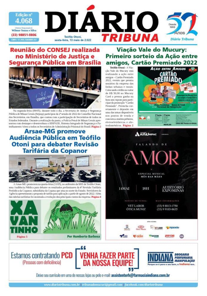 Diário Tribuna, 13 de Maio 2022, Teófilo Otoni – MG Por diariotribuna - 13/05/2022 0 469 Facebook Twitter Google+ Pinterest WhatsApp Acesse o link abaixo e veja a edição completa do Diário Tribuna desta sexta-feira (13/05/2022) https://diariotribuna.com.br/wp-content/uploads/2022/05/DIARIO-TRIBUNA-52-ANOS-13-MAIO-2022.pdf