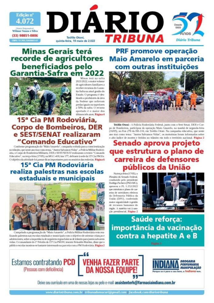 Diário Tribuna, 19 de Maio 2022, Teófilo Otoni – MG Por diariotribuna - 19/05/2022 0 503 Facebook Twitter Google+ Pinterest WhatsApp Acesse o link abaixo e veja a edição completa do Diário Tribuna desta quinta-feira (19/05/2022) https://diariotribuna.com.br/wp-content/uploads/2022/05/DIARIO-TRIBUNA-52-ANOS-19-MAIO-2022.pdf