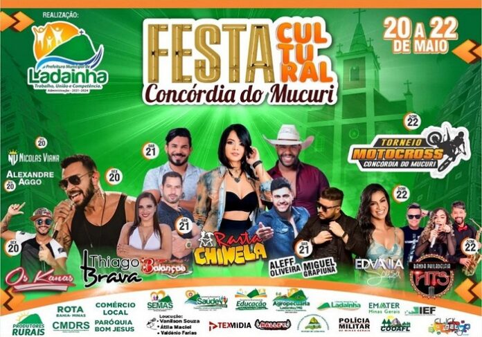 A Prefeitura Municipal de Ladainha realiza neste fim de semana, de 20 a 22 de maio, a tradicional Festa Cultural de Concórdia do Mucuri, ressaltando que na semana anterior no domingo (15), foi realizada a tradicional cavalgada que abre as festividades. A festa de Concórdia do Mucuri proporciona muita diversão à população local e convidados das cidades circunvizinhas, e neste fim de semana vai contar com animados shows com artistas regionais e também a nível nacional.