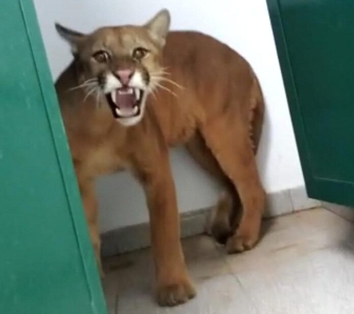 A Polícia Militar e Corpo de Bombeiros foram acionados e no local, os bombeiros conseguiram confinar o animal no vestiário, em segurança. Ela estava acuada, com aparência saudável e sem lesões. Por volta das 14h, a onça foi sedada e capturada. Apesar do susto, felizmente ninguém se feriu. (Imagens: Divulgação).