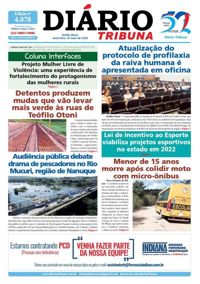 Diário Tribuna, 27 de Maio 2022, Teófilo Otoni – MG Por diariotribuna - 27/05/2022 0 649 Facebook Twitter Google+ Pinterest WhatsApp Acesse o link abaixo e veja a edição completa do Diário Tribuna desta sexta-feira (27/05/2022) https://diariotribuna.com.br/wp-content/uploads/2022/05/DIARIO-TRIBUNA-52-ANOS-27-MAIO-2022.pdf