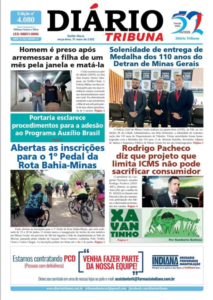 Diário Tribuna, 31 de Maio 2022, Teófilo Otoni – MG Por diariotribuna - 31/05/2022 0 642 Facebook Twitter Google+ Pinterest WhatsApp Acesse o link abaixo e veja a edição completa do Diário Tribuna desta terça-feira (31/05/2022) https://diariotribuna.com.br/wp-content/uploads/2022/05/DIARIO-TRIBUNA-52-ANOS-31-MAIO-2022.pdf