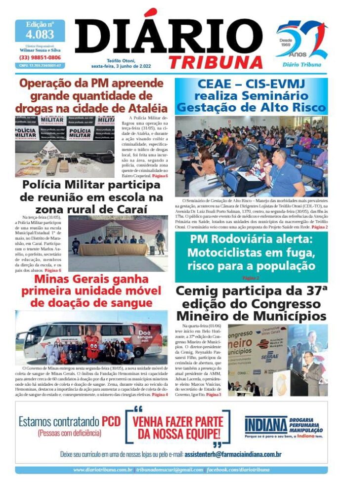 Diário Tribuna, 03 de Junho 2022, Teófilo Otoni – MG Por diariotribuna - 03/06/2022 0 567 Facebook Twitter Google+ Pinterest WhatsApp Acesse o link abaixo e veja a edição completa do Diário Tribuna desta sexta-feira (03/06/2022) https://diariotribuna.com.br/wp-content/uploads/2022/06/DIARIO-TRIBUNA-52-ANOS-03-JUNHO-2022.pdf