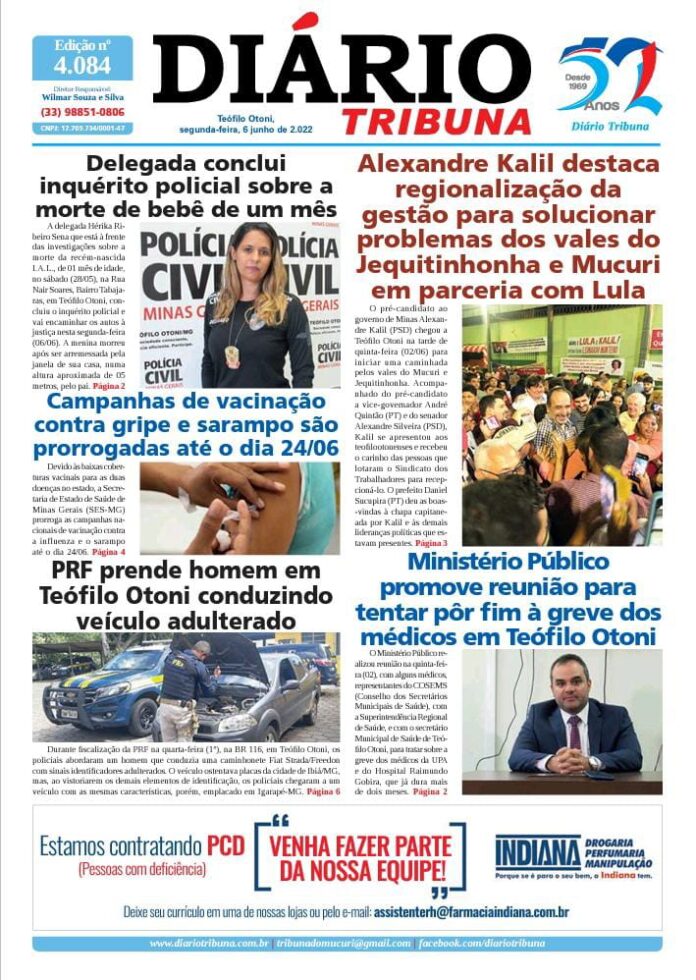Diário Tribuna, 06 de Junho 2022, Teófilo Otoni – MG Por diariotribuna - 06/06/2022 0 781 Facebook Twitter Google+ Pinterest WhatsApp Acesse o link abaixo e veja a edição completa do Diário Tribuna desta segunda-feira (06/06/2022) https://diariotribuna.com.br/wp-content/uploads/2022/06/DIARIO-TRIBUNA-52-ANOS-06-JUNHO-2022.pdf