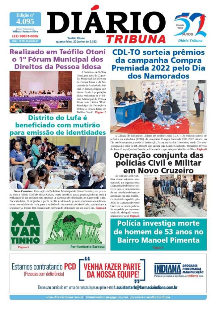 Diário Tribuna, 22 de Junho 2022, Teófilo Otoni – MG Por diariotribuna - 22/06/2022 0 432 Facebook Twitter Google+ Pinterest WhatsApp Acesse o link abaixo e veja a edição completa do Diário Tribuna desta quarta-feira (22/06/2022) https://diariotribuna.com.br/wp-content/uploads/2022/06/DIARIO-TRIBUNA-52-ANOS-22-JUNHO-2022.pdf
