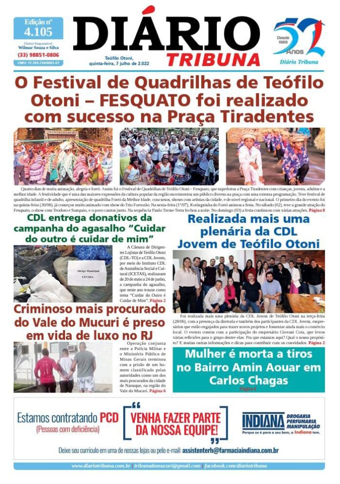 Diário Tribuna, 07 de Julho 2022, Teófilo Otoni – MG Por diariotribuna - 07/07/2022 0 451 Facebook Twitter Google+ Pinterest WhatsApp Acesse o link abaixo e veja a edição completa do Diário Tribuna desta quinta-feira (07/07/2022) https://diariotribuna.com.br/wp-content/uploads/2022/07/DIARIO-TRIBUNA-52-ANOS-07-JULHO-2022.pdf