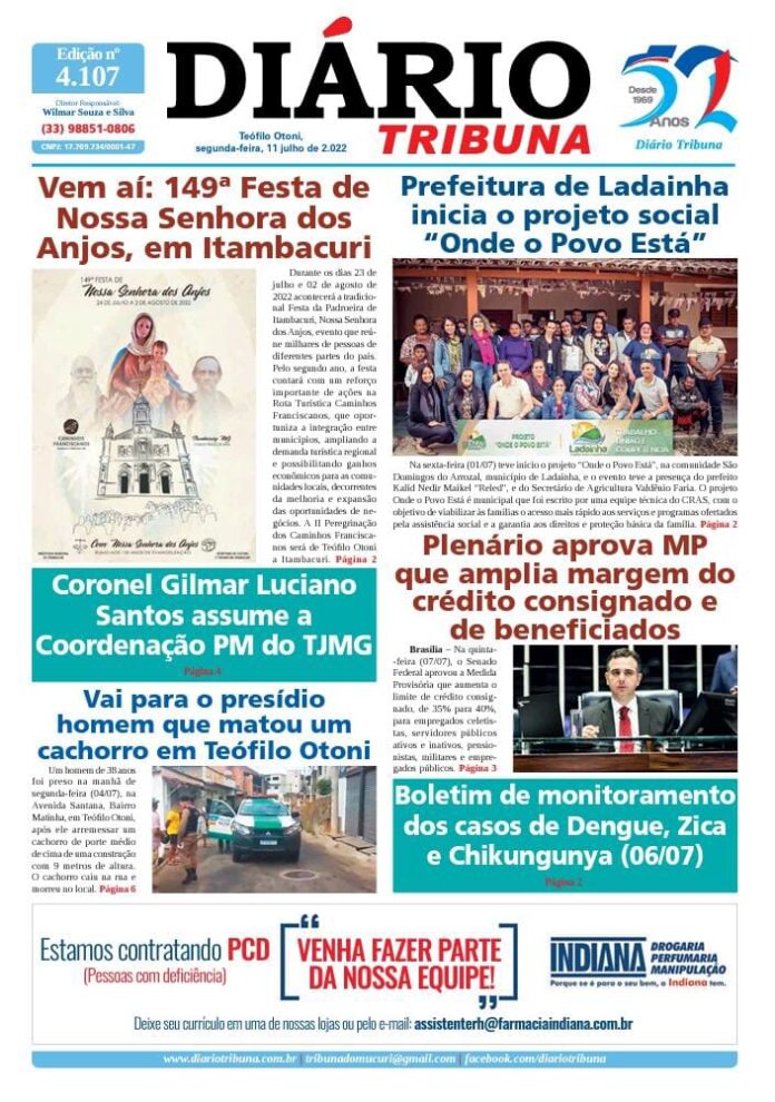Diário Tribuna, 11 de Julho 2022, Teófilo Otoni – MG Por diariotribuna - 11/07/2022 0 509 Facebook Twitter Google+ Pinterest WhatsApp Acesse o link abaixo e veja a edição completa do Diário Tribuna desta segunda-feira (11/07/2022) https://diariotribuna.com.br/wp-content/uploads/2022/07/DIARIO-TRIBUNA-52-ANOS-11-JULHO-2022.pdf