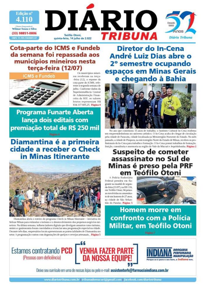 Diário Tribuna, 14 de Julho 2022, Teófilo Otoni – MG Por diariotribuna - 14/07/2022 0 515 Facebook Twitter Google+ Pinterest WhatsApp Acesse o link abaixo e veja a edição completa do Diário Tribuna desta quinta-feira (14/07/2022) https://diariotribuna.com.br/wp-content/uploads/2022/07/DIARIO-TRIBUNA-52-ANOS-14-JULHO-2022.pdf