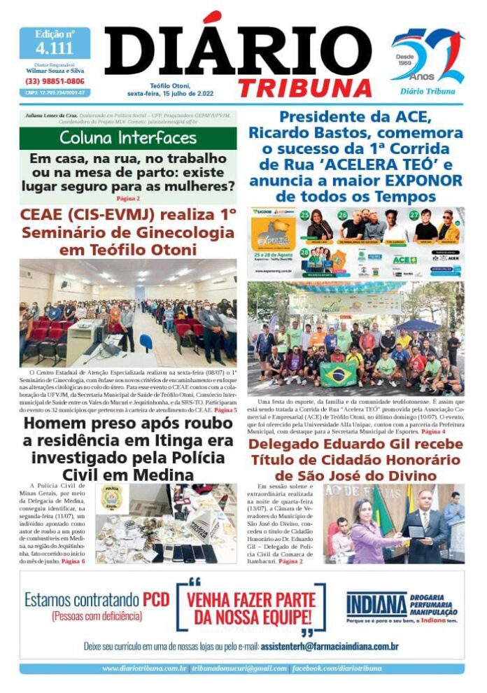 Diário Tribuna, 15 de Julho 2022, Teófilo Otoni – MG Por diariotribuna - 15/07/2022 0 391 Facebook Twitter Google+ Pinterest WhatsApp Acesse o link abaixo e veja a edição completa do Diário Tribuna desta sexta-feira (15/07/2022) https://diariotribuna.com.br/wp-content/uploads/2022/07/DIARIO-TRIBUNA-52-ANOS-15-JULHO-2022.pdf