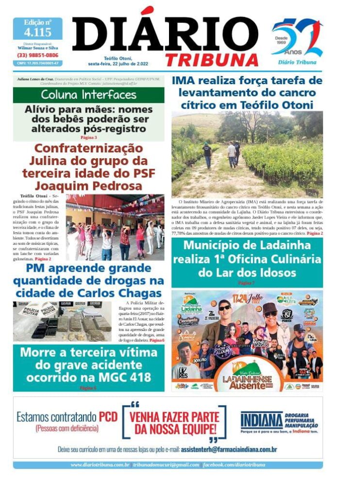 Diário Tribuna, 22 de Julho 2022, Teófilo Otoni – MG Por diariotribuna - 22/07/2022 0 604 Facebook Twitter Google+ Pinterest WhatsApp Acesse o link abaixo e veja a edição completa do Diário Tribuna desta sexta-feira (22/07/2022) https://diariotribuna.com.br/wp-content/uploads/2022/07/DIARIO-TRIBUNA-52-ANOS-22-JULHO-2022.pdf