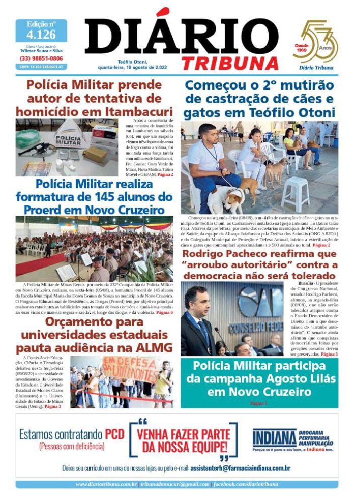 Diário Tribuna, 10 de Agosto 2022, Teófilo Otoni – MG Por diariotribuna - 12/08/2022 0 259 Facebook Twitter Google+ Pinterest WhatsApp Acesse o link abaixo e veja a edição completa do Diário Tribuna desta quarta-feira (10/08/2022) https://diariotribuna.com.br/wp-content/uploads/2022/08/DIARIO-TRIBUNA-52-ANOS-10-AGOSTO-2022.pdf
