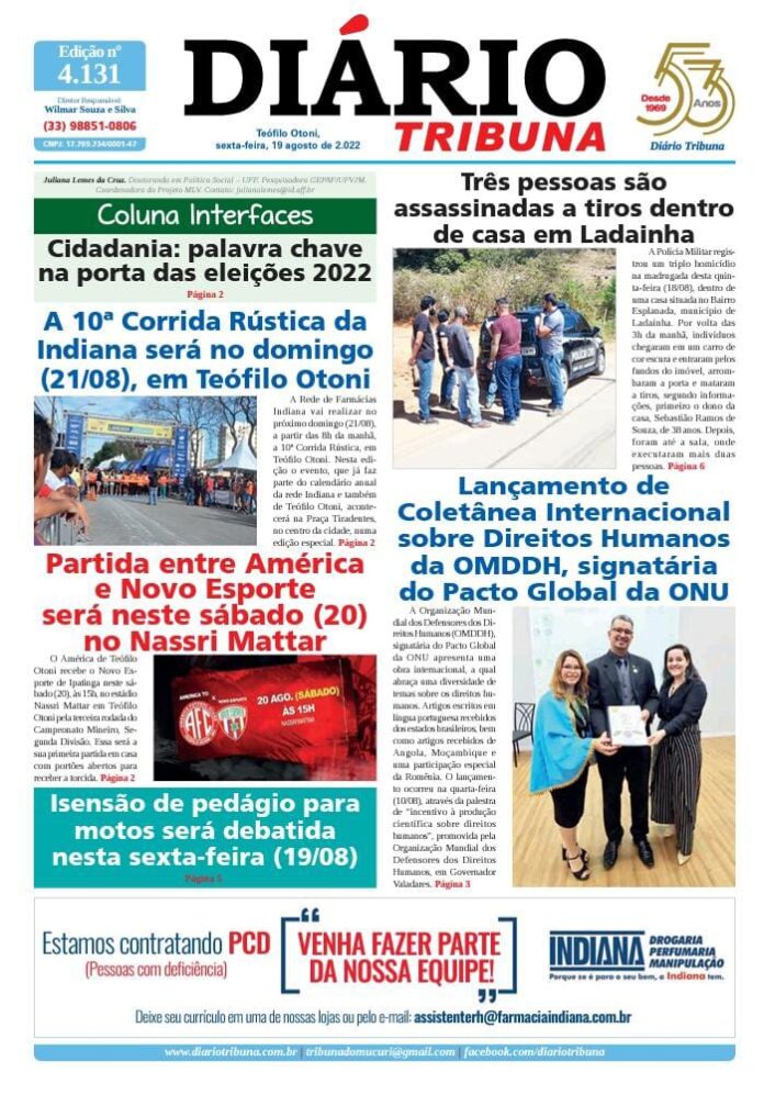 Diário Tribuna, 19 de Agosto 2022, Teófilo Otoni – MG Por diariotribuna - 19/08/2022 0 725 Facebook Twitter Google+ Pinterest WhatsApp Acesse o link abaixo e veja a edição completa do Diário Tribuna desta sexta-feira (19/08/2022) https://diariotribuna.com.br/wp-content/uploads/2022/08/DIARIO-TRIBUNA-53-ANOS-19-AGOSTO-2022.pdf