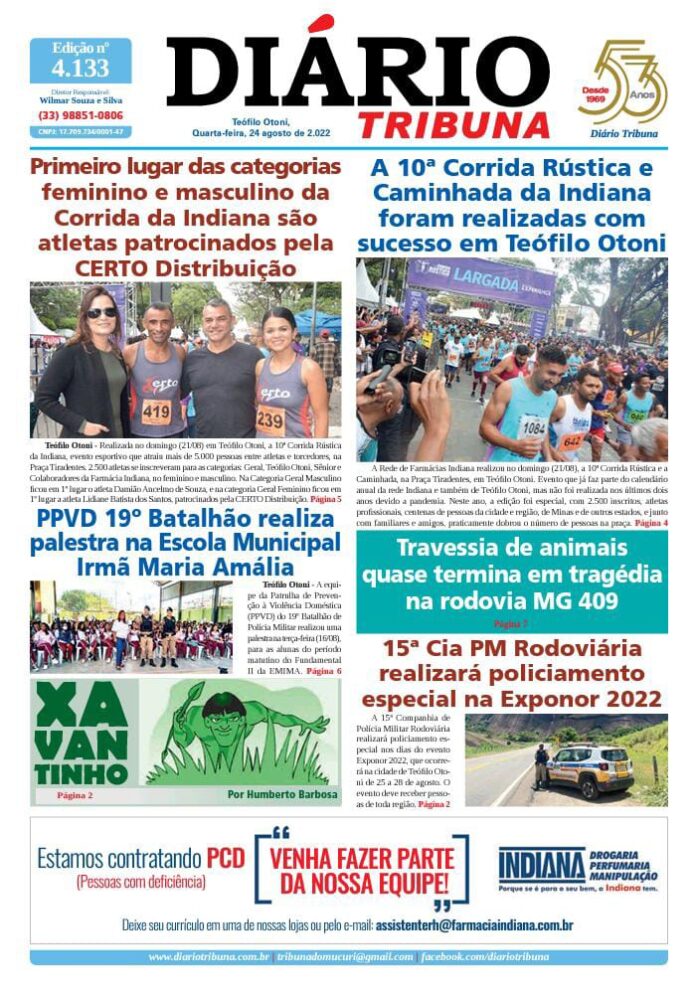 Diário Tribuna, 24 de Agosto 2022, Teófilo Otoni – MG Por diariotribuna - 24/08/2022 0 274 Facebook Twitter Google+ Pinterest WhatsApp Acesse o link abaixo e veja a edição completa do Diário Tribuna desta quarta-feira (24/08/2022) https://diariotribuna.com.br/wp-content/uploads/2022/08/DIARIO-TRIBUNA-53-ANOS-24-AGOSTO-2022.pdf