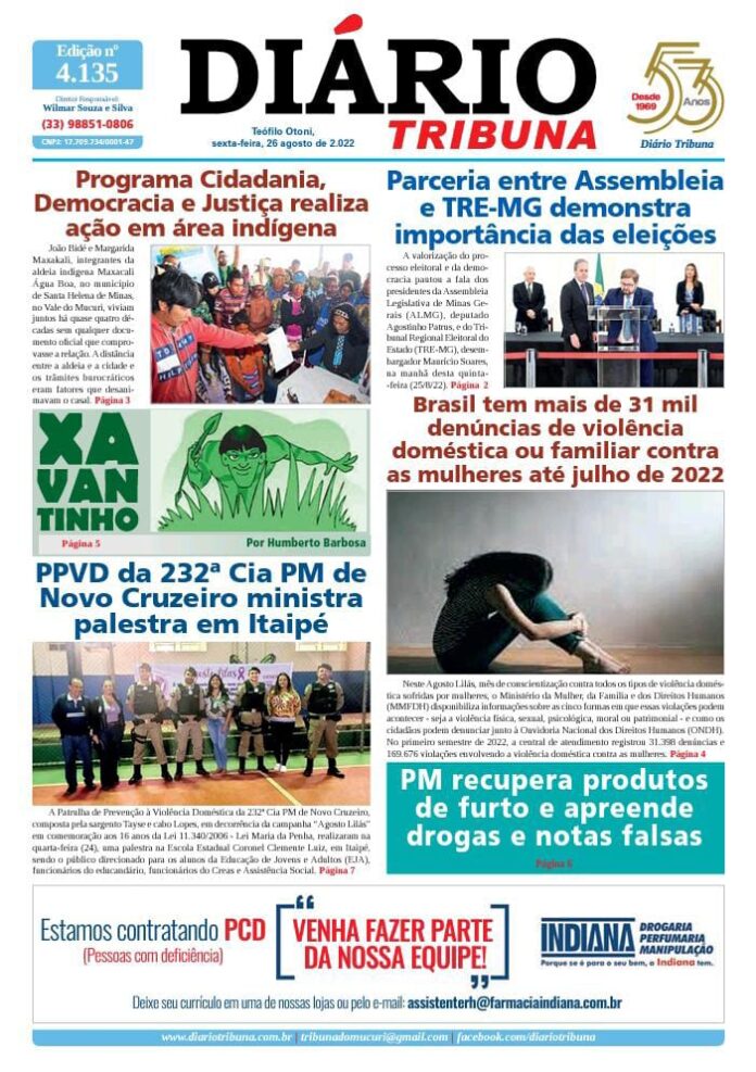 Diário Tribuna, 26 de Agosto 2022, Teófilo Otoni – MG Por diariotribuna - 26/08/2022 0 393 Facebook Twitter Google+ Pinterest WhatsApp Acesse o link abaixo e veja a edição completa do Diário Tribuna desta sexta-feira (26/08/2022) https://diariotribuna.com.br/wp-content/uploads/2022/08/DIARIO-TRIBUNA-53-ANOS-26-AGOSTO-2022.pdf