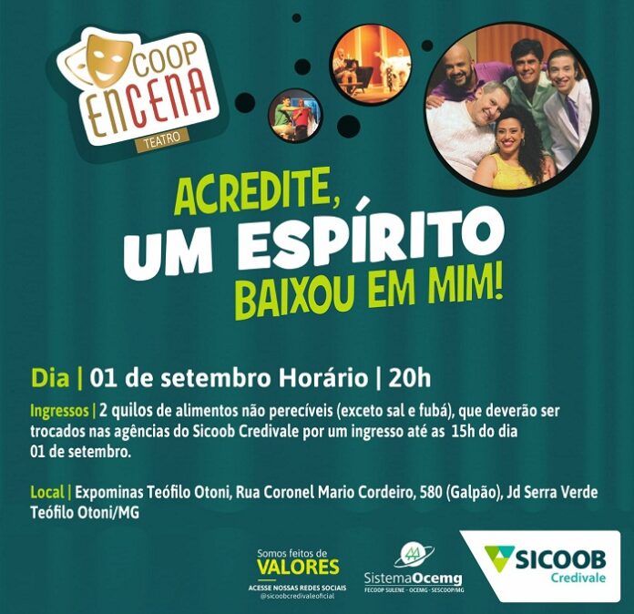 Teófilo Otoni – O Instituto Cultural Sicoob Credivale apresenta o 1º Coop Encena de Teófilo Otoni, com a peça teatral “Acredite, um espírito baixou em mim”, na quinta-feira (01/09), às 20h, no Expominas, na Rua Mário Cordeiro, 580, Jardim Serra Verde. O ingresso pode ser retirado nas agências do Sicoob Credivale, por 02 quilos de alimentos não perecíveis (exceto sal e fubá), até às 15h do dia 1º de setembro. Os ingressos são limitados e a classificação é a partir de 14 anos.