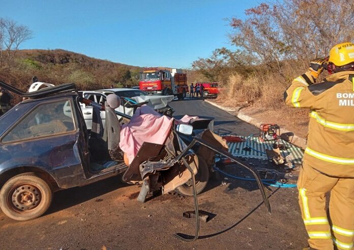 Araçuaí – O acidente aconteceu na tarde de sábado (03/09), na rodovia BR-367, KM 302, em Araçuaí. Uma pessoa morreu e três ficaram feridas em uma colisão frontal envolvendo dois automóveis, um VW/Gol cor branca e um Ford/Escort cor azul, do município de Embu/SP. Populares já haviam acionado equipes do Samu e Corpo de Bombeiros, e os militares sinalizaram a via e controlaram o fluxo que foi impedido nos dois sentidos pra que as equipes prestassem o socorro às vítimas.