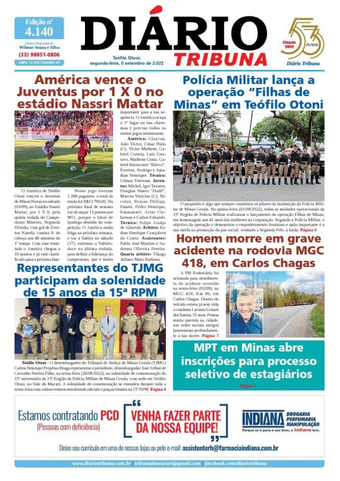Diário Tribuna, 05 de Setembro 2022, Teófilo Otoni – MG Por diariotribuna - 05/09/2022 0 369 Facebook Twitter Google+ Pinterest WhatsApp Acesse o link abaixo e veja a edição completa do Diário Tribuna desta segunda-feira (05/09/2022) https://diariotribuna.com.br/wp-content/uploads/2022/09/DIARIO-TRIBUNA-53-ANOS-05-SETEMBRO-2022.pdf