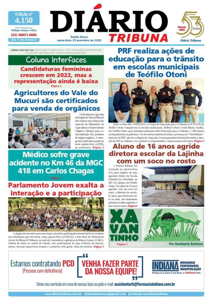Diário Tribuna, 23 de Setembro 2022, Teófilo Otoni – MG Por diariotribuna - 23/09/2022 0 278 Facebook Twitter Google+ Pinterest WhatsApp Acesse o link abaixo e veja a edição completa do Diário Tribuna desta sexta-feira (23/09/2022) https://diariotribuna.com.br/wp-content/uploads/2022/09/DIARIO-TRIBUNA-53-ANOS-23-SETEMBRO-2022.pdf
