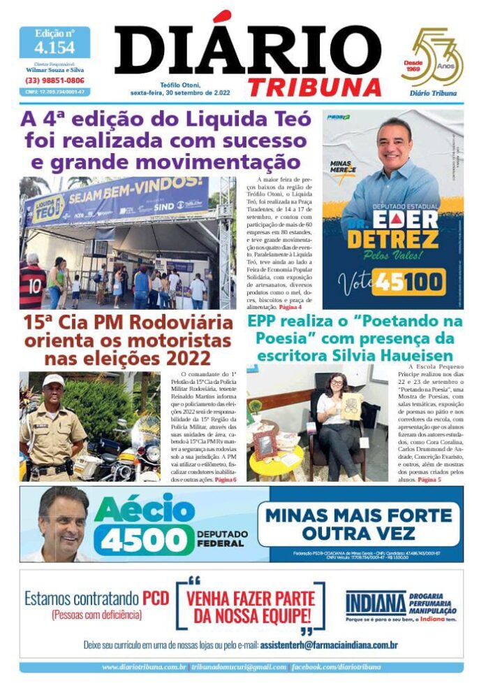 Diário Tribuna, 30 de Setembro 2022, Teófilo Otoni – MG Por diariotribuna - 30/09/2022 0 221 Facebook Twitter Google+ Pinterest WhatsApp Acesse o link abaixo e veja a edição completa do Diário Tribuna desta sexta-feira (30/09/2022) https://diariotribuna.com.br/wp-content/uploads/2022/09/DIARIO-TRIBUNA-53-ANOS-30-SETEMBRO-2022.pdf