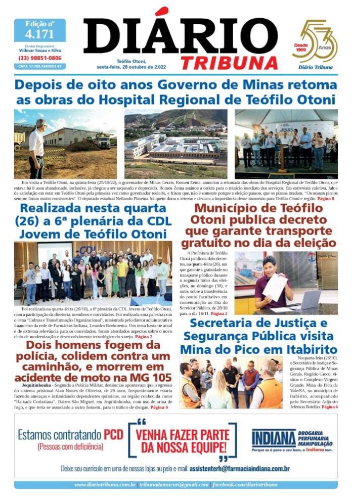 Diário Tribuna, 28 de Outubro 2022, Teófilo Otoni – MG Por diariotribuna - 28/10/2022 0 359 Facebook Twitter Google+ Pinterest WhatsApp Acesse o link abaixo e veja a edição completa do Diário Tribuna desta sexta-feira (28/10/2022) https://diariotribuna.com.br/wp-content/uploads/2022/10/DIARIO-TRIBUNA-53-ANOS-28-OUTUBRO-2022.pdf