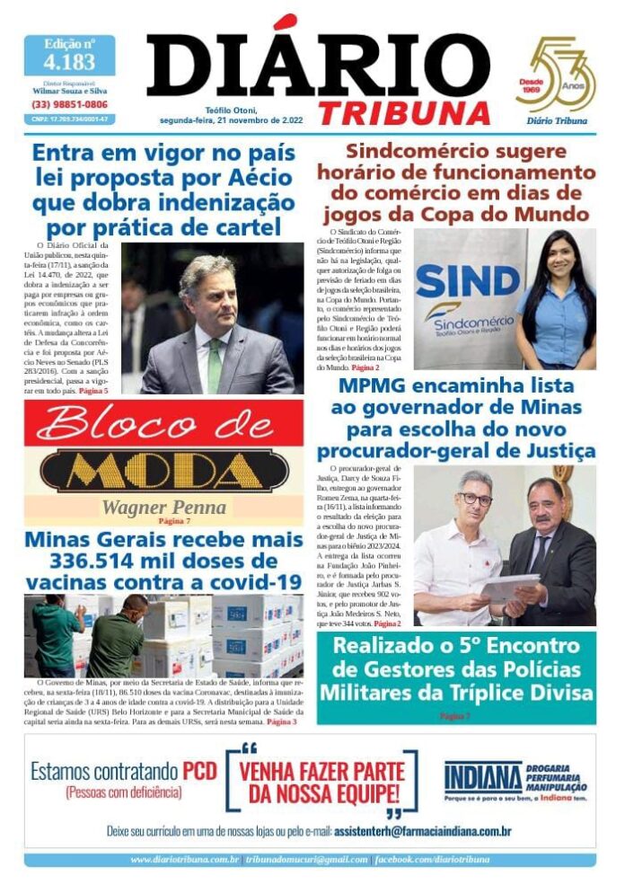 Diário Tribuna, 21 de Novembro 2022, Teófilo Otoni – MG Por diariotribuna - 21/11/2022 0 337 Facebook Twitter Google+ Pinterest WhatsApp Acesse o link abaixo e veja a edição completa do Diário Tribuna desta segunda-feira (21/11/2022) https://diariotribuna.com.br/wp-content/uploads/2022/11/DIARIO-TRIBUNA-53-ANOS-21-NOVEMBRO-2022.pdf