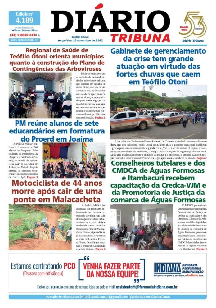 Diário Tribuna, 29 de Novembro 2022, Teófilo Otoni – MG Por diariotribuna - 29/11/2022 0 294 Facebook Twitter Google+ Pinterest WhatsApp Acesse o link abaixo e veja a edição completa do Diário Tribuna desta terça-feira (29/11/2022) https://diariotribuna.com.br/wp-content/uploads/2022/11/DIARIO-TRIBUNA-53-ANOS-29-NOVEMBRO-2022.pdf