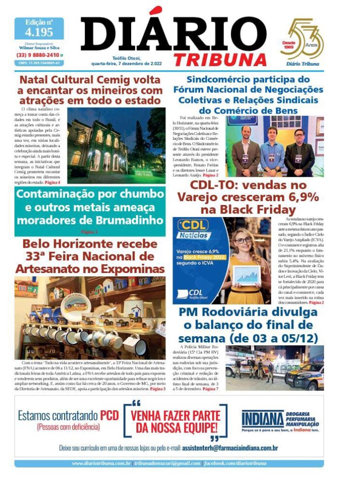 Diário Tribuna, 7 de Dezembro 2022, Teófilo Otoni – MG Por diariotribuna - 07/12/2022 0 277 Facebook Twitter Google+ Pinterest WhatsApp Acesse o link abaixo e veja a edição completa do Diário Tribuna desta quarta-feira (07/12/2022) https://diariotribuna.com.br/wp-content/uploads/2022/12/DIARIO-TRIBUNA-53-ANOS-07-DEZEMBRO-2022.pdf