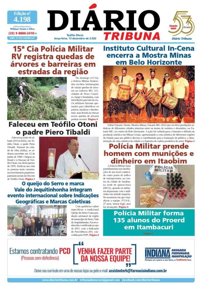 Diário Tribuna, 13 de Dezembro 2022, Teófilo Otoni – MG Por diariotribuna - 13/12/2022 0 263 Facebook Twitter Google+ Pinterest WhatsApp Acesse o link abaixo e veja a edição completa do Diário Tribuna desta terça-feira (13/12/2022) https://diariotribuna.com.br/wp-content/uploads/2022/12/DIARIO-TRIBUNA-53-ANOS-13-DEZEMBRO-2022.pdf